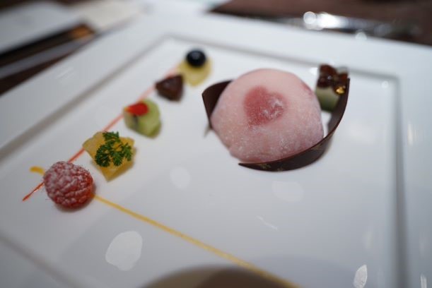 (私の好きな花を沢山入れてくれたメインテーブル装花と、唯一完食できた可愛いデザート。お花は当日まで見ることができないのでドキドキ)