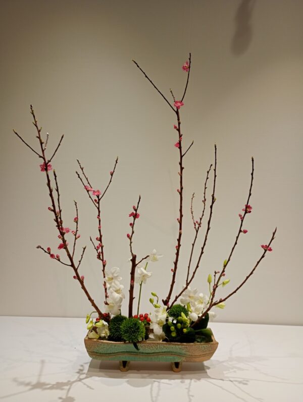 また、祝いの象徴である紅白を用い、左に赤花、右に白花を配しています。