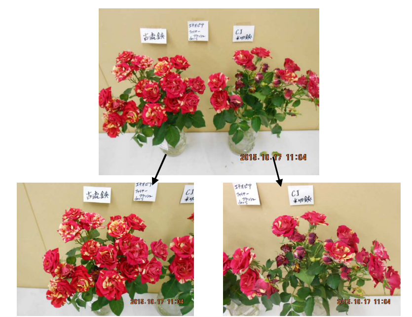 Many of the readers of this blog is the professionals of flowers, so it’s like teaching fishes to swim, but you can easily see how scissors (or cutting quality) can influence flowers by comparing the data (refer to the picture on the right). The result is quite obvious! One of the very basics of flower care is to cut the stem with a blade with sharp cutting edge so that it won’t squash vessels of flowers. Blade sharpeners are available from 100-yen in Japan—we recommend to sharpen the blade every once in a while.